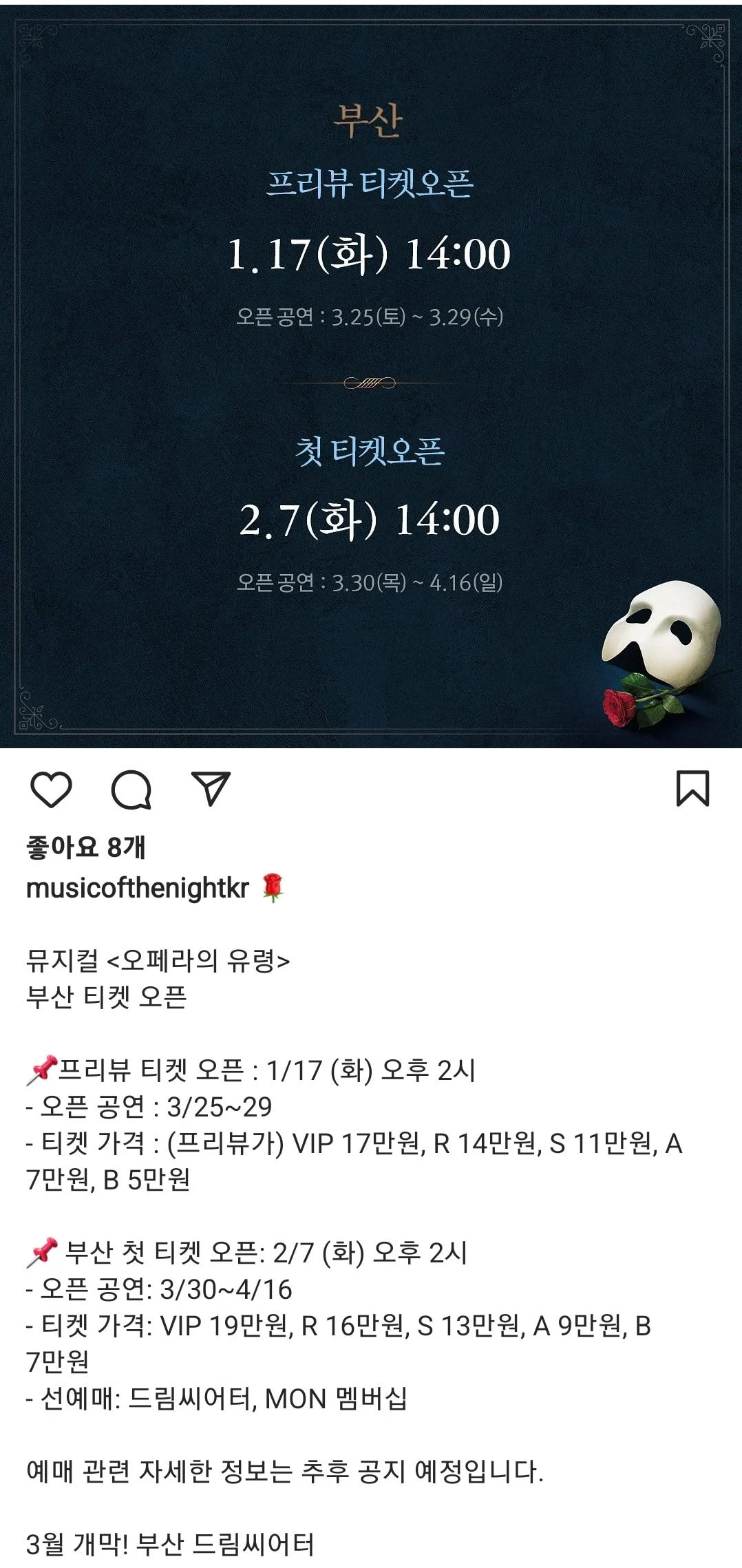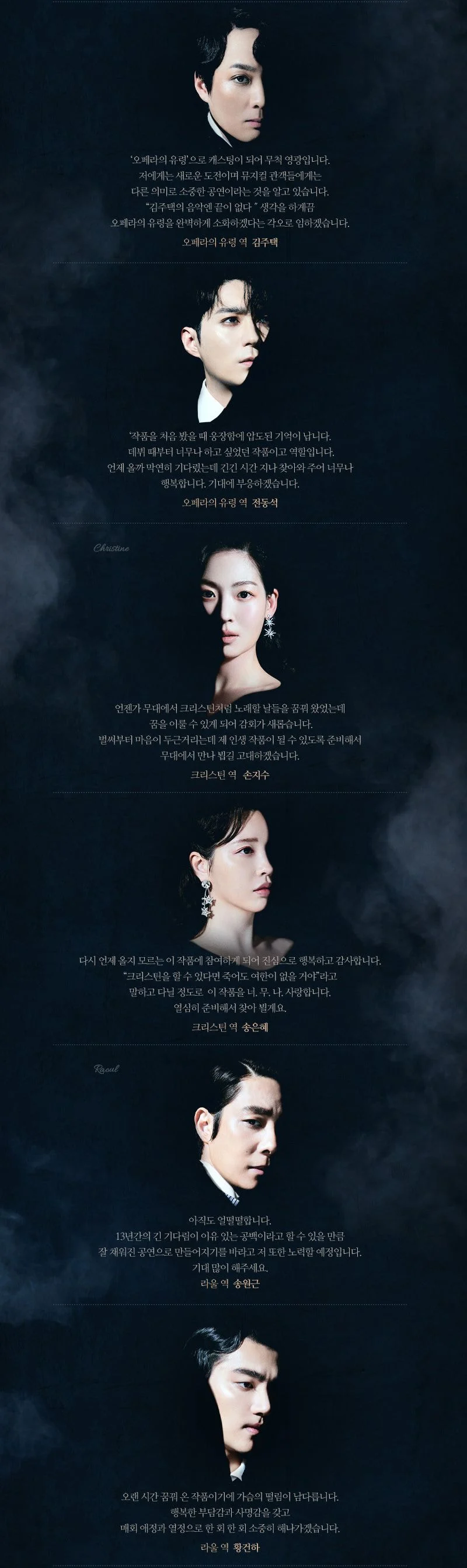 이어 "우연처럼 다가와 준, 그리고 기회를 준 작품과 앤드루 로이드 웨버 선생님께 감사함을 느낀다. 유령으로 언제 다시 마스크를 쓸 수 있겠나"라며 "늘 새로운 것에 대한 갈증이 있었고, 스스로를 재정비하고 싶은 의지가 강하게 있었는데 초심으로 돌아가게 만드는 작품인 것 같다. 긴장과 두려움 그리고 기대가 공존한다"라고 전했다.